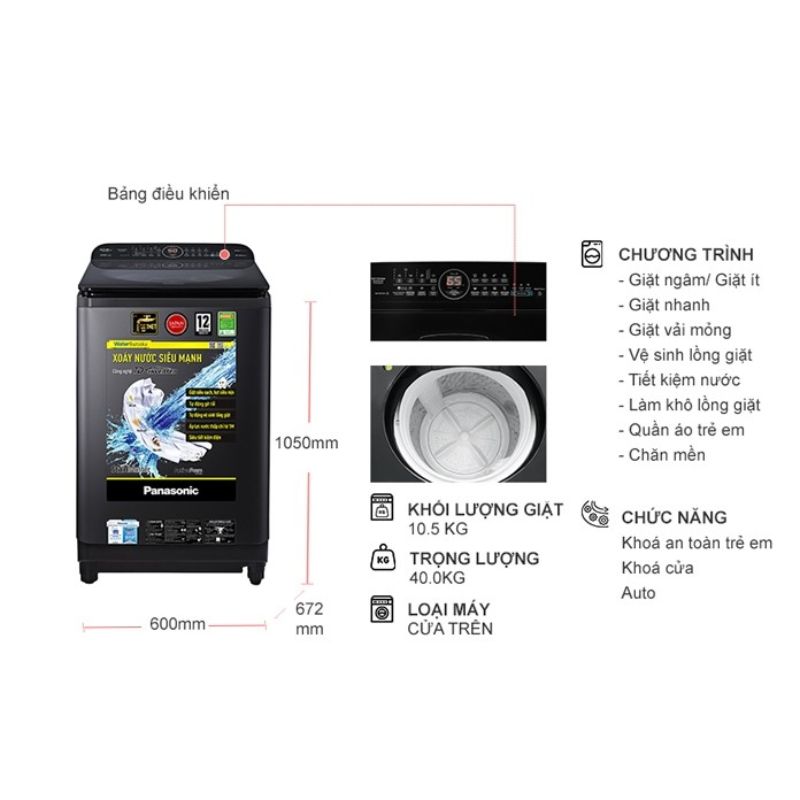 - Máy giặt lồng đứng, thiết kế hiện đại: Máy Giặt Panasonic Inverter 10,5 Kg NA-FD10AR1BV lấy đen làm tông màu chủ đạo để tạo nên tổng thể máy sang trọng, hiện đại, đồng thời cũng giúp người dùng dễ dàng kết hợp cùng nhiều phong cách nội thất mà không tạo ra cảm giác lạc lõng. Sản phẩm này thuộc kiểu máy giặt Panasonic cửa trên lồng đứng giúp người dùng thuận tiện cho đồ vào lồng giặt mà không phải cúi thấp người.